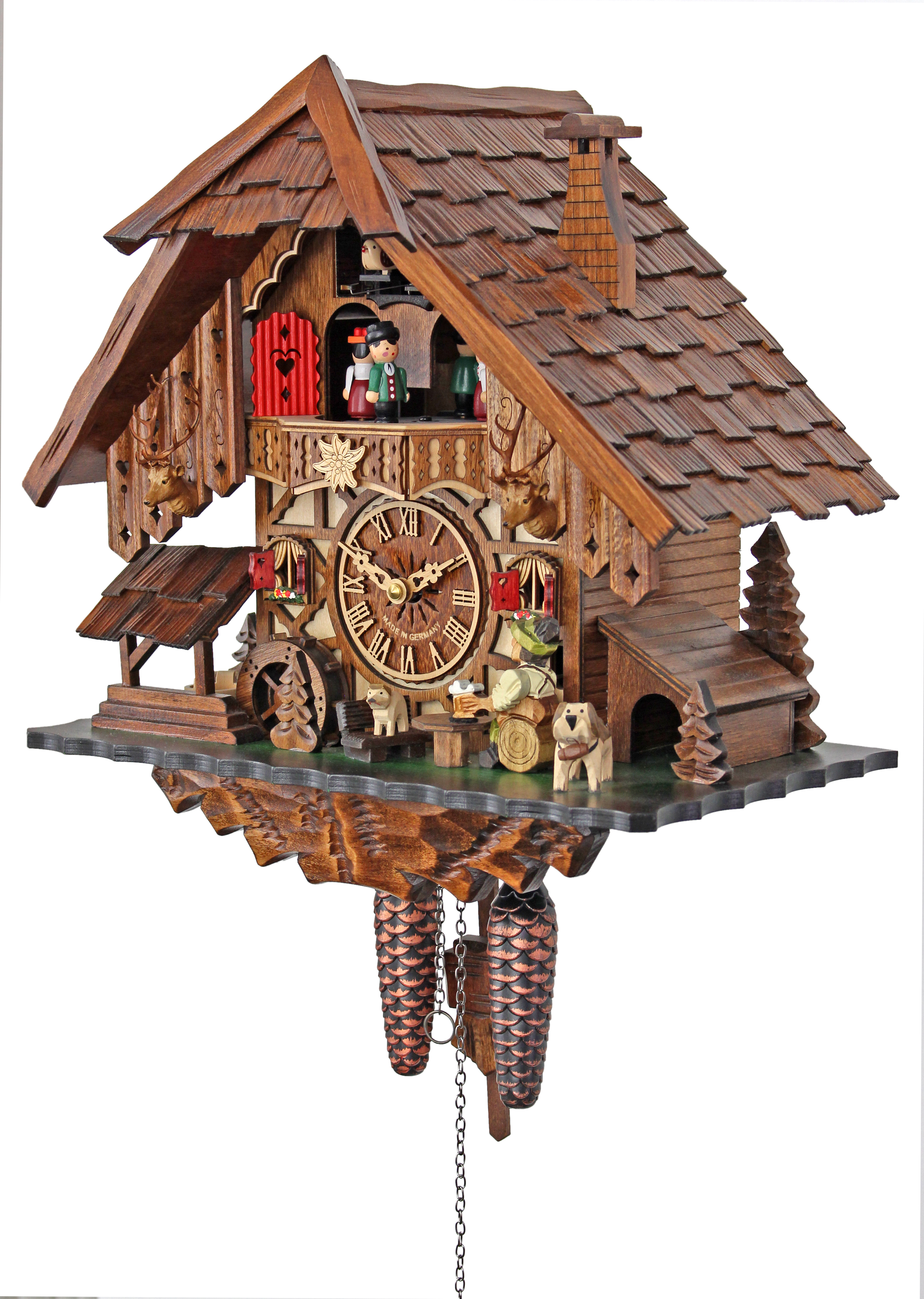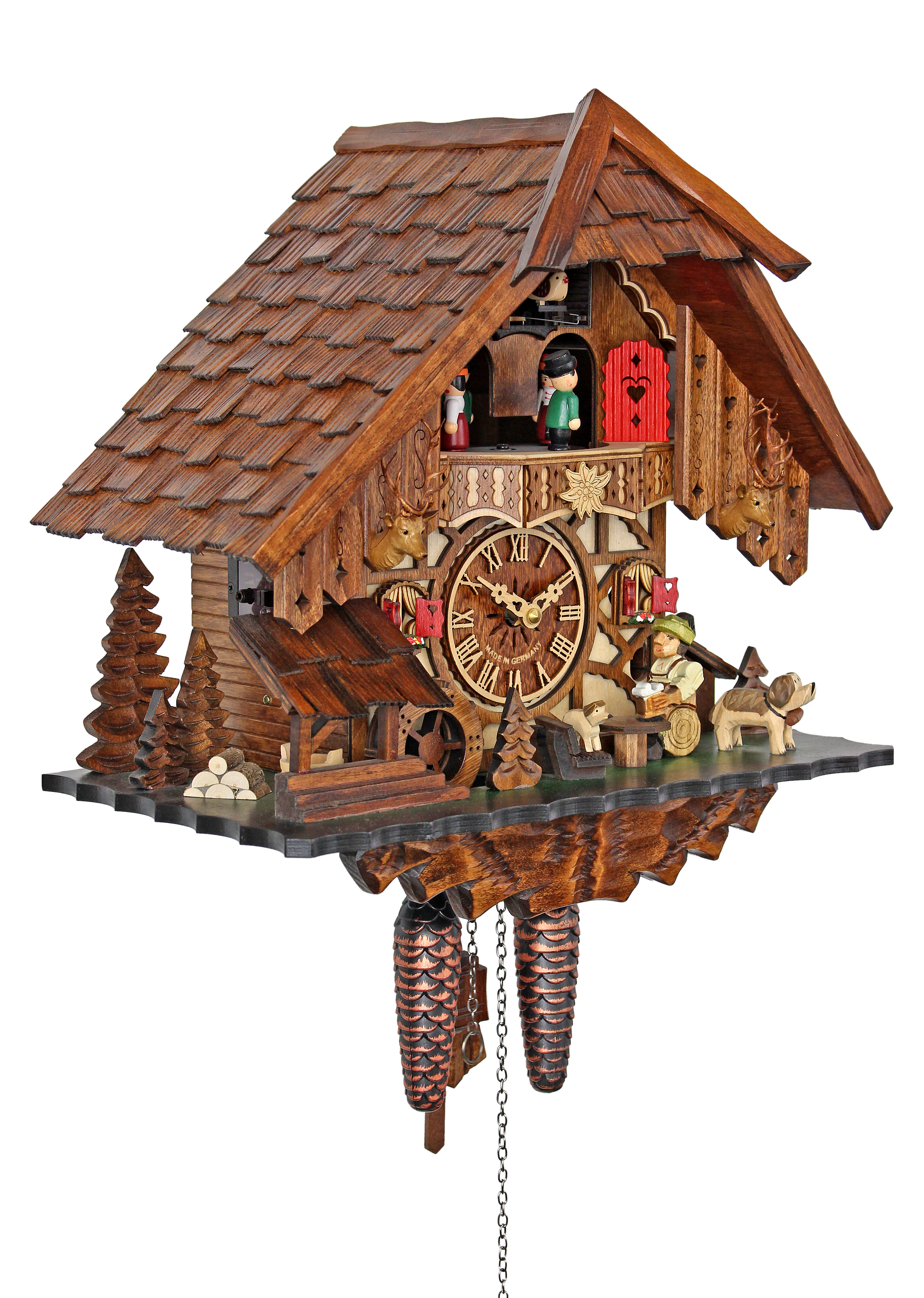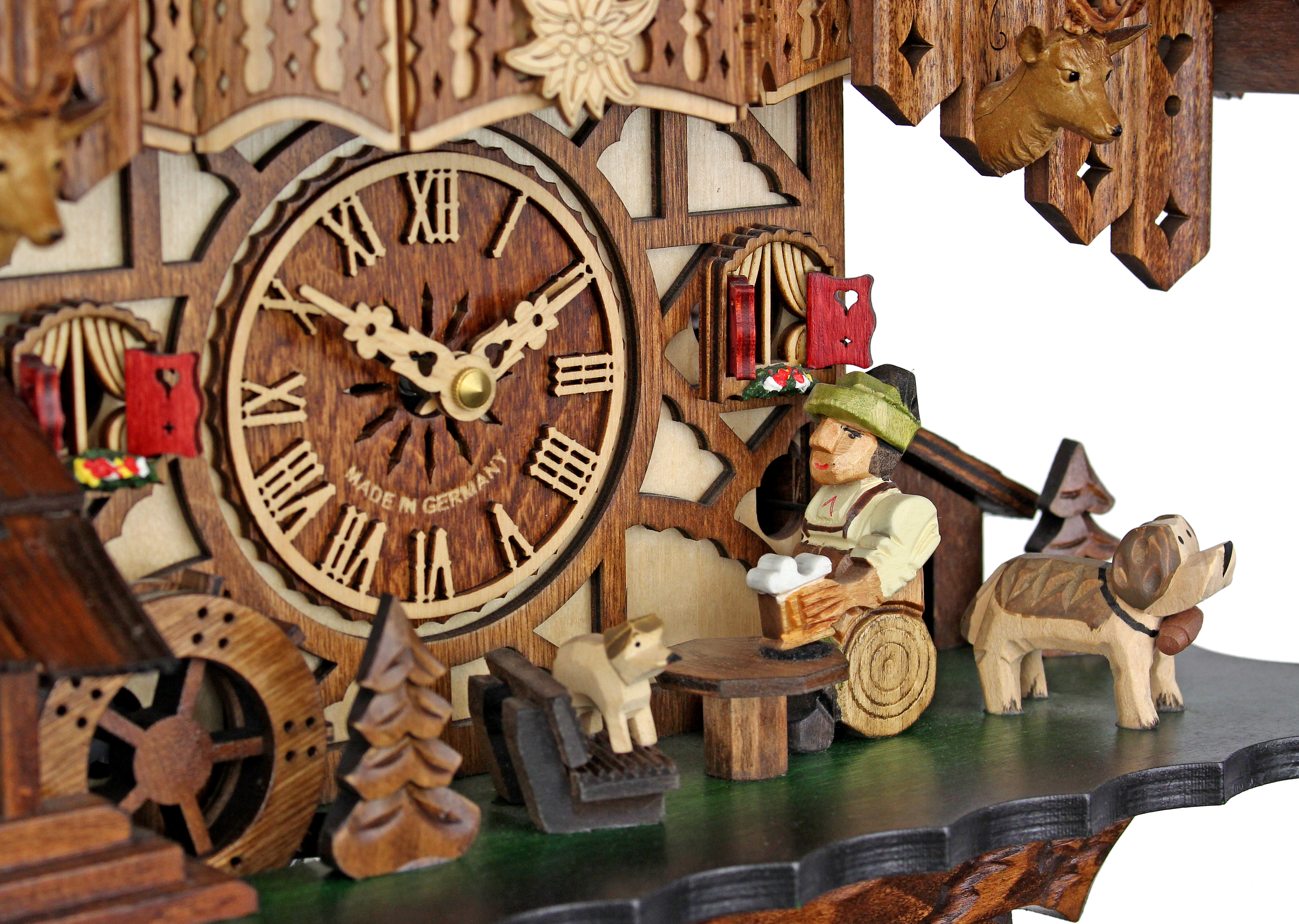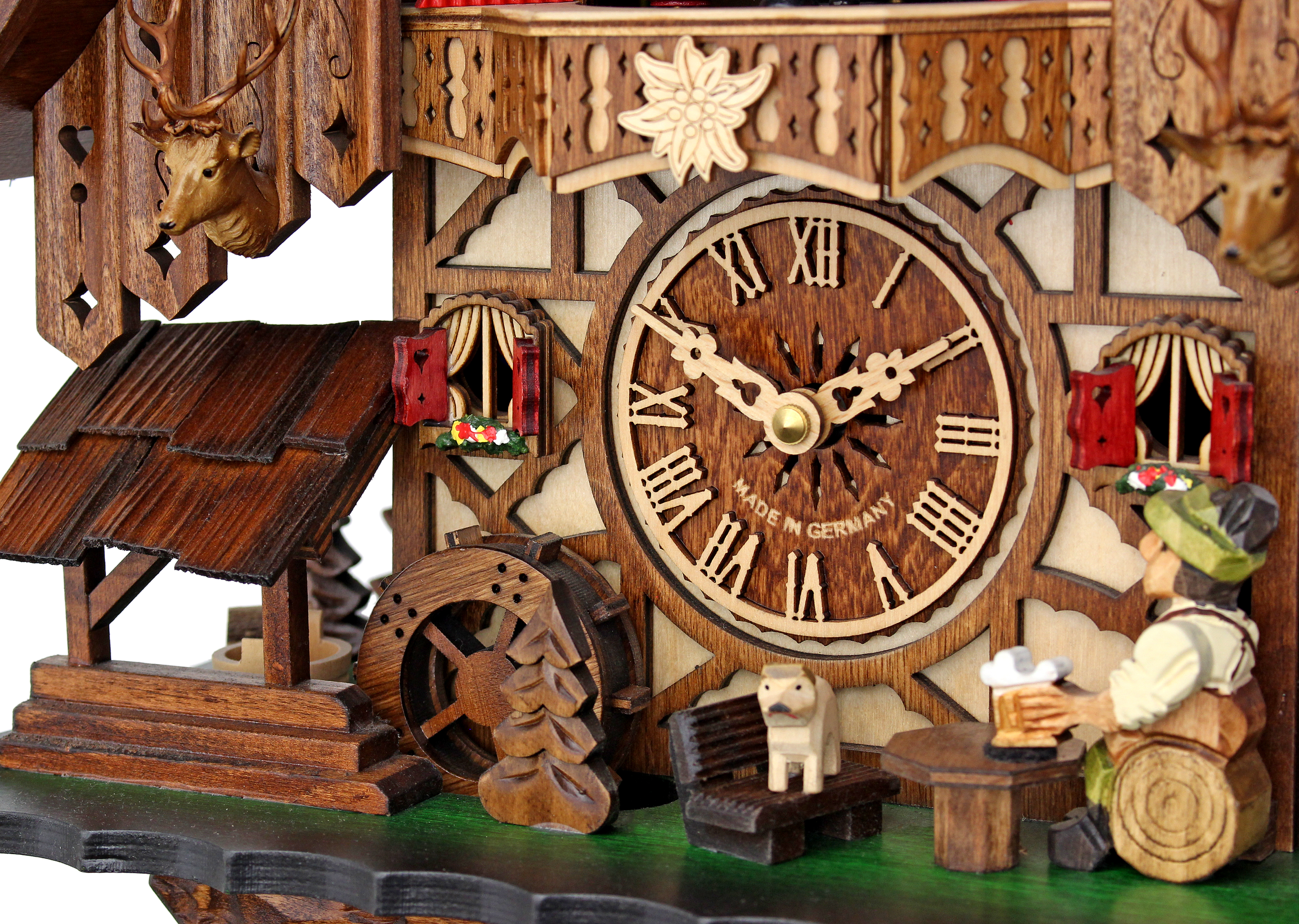 A cuckoo clock with a typical Black Forest house with a shingled roof, a chimney, deer head trophies and surrounding fir trees. The beer drinker raises his mug on the hour in time to the cuckoo call and its echo. One of 12 different alternating melodies follows, while the water wheel turns and the figurines wearing their Black Forest traditional costume dance around to the music. A light sensor automatically turns off the cuckoo sound and the music at night, or they can be turned off anytime by means of a manual switch. In stock - worldwide delivery