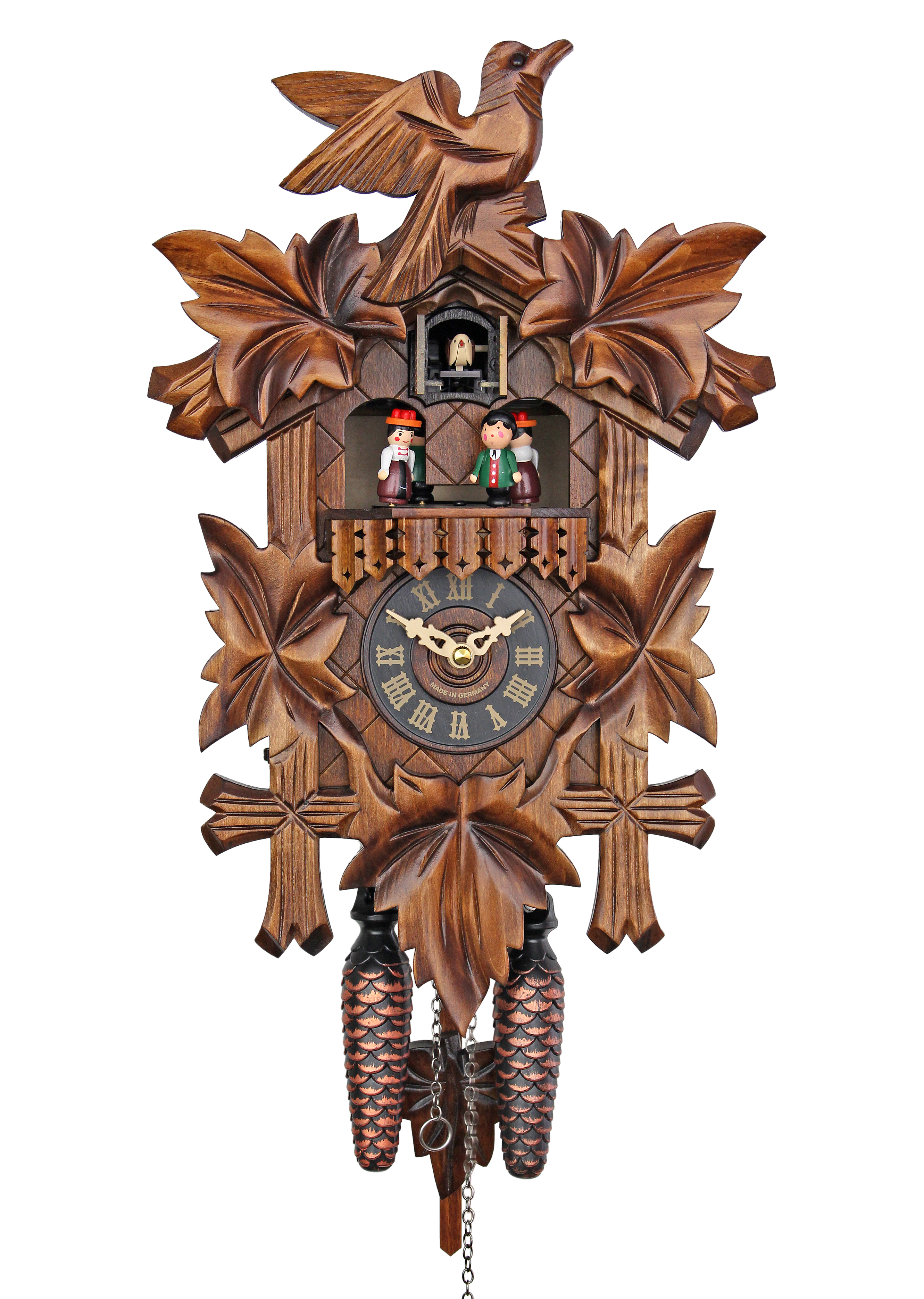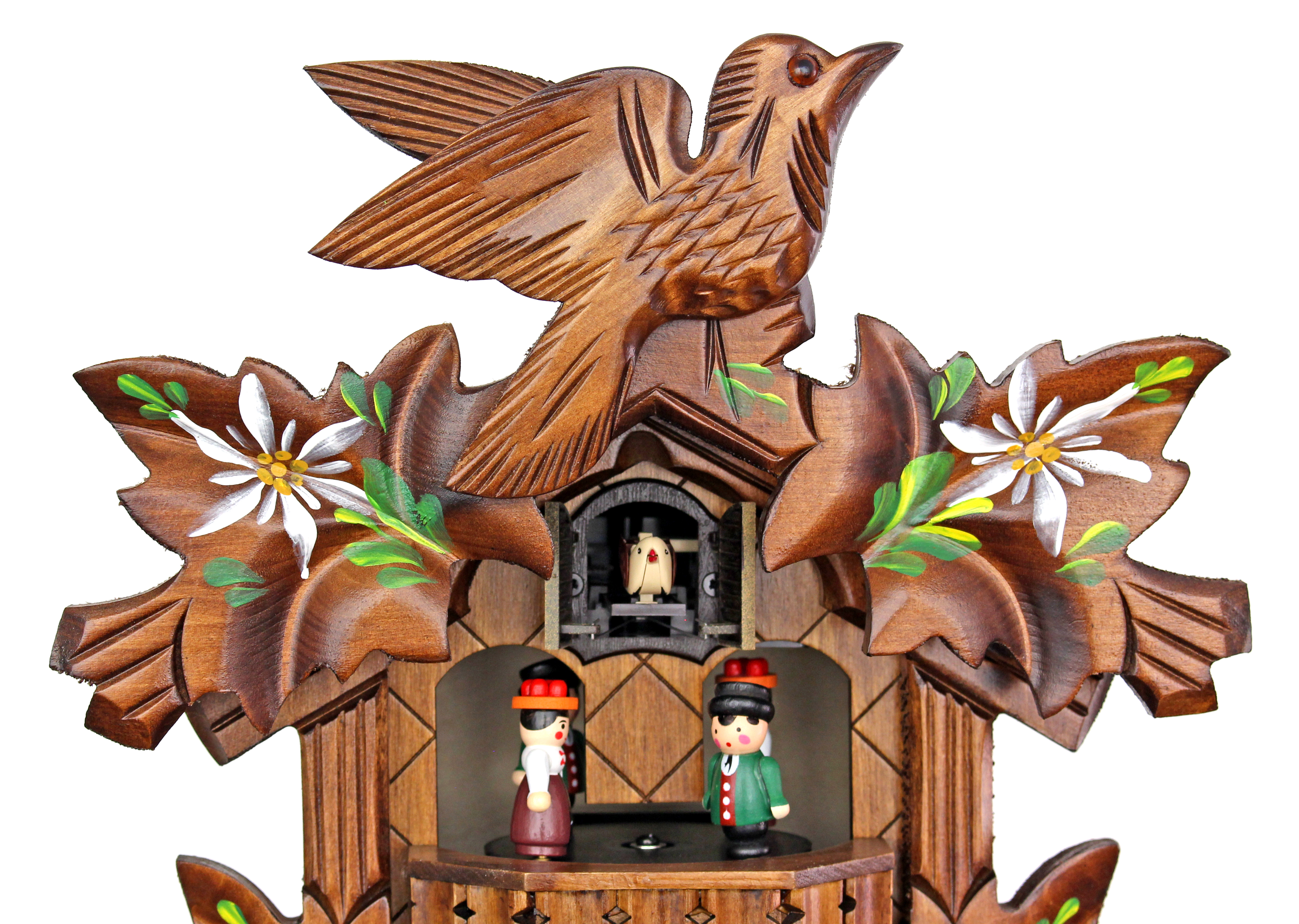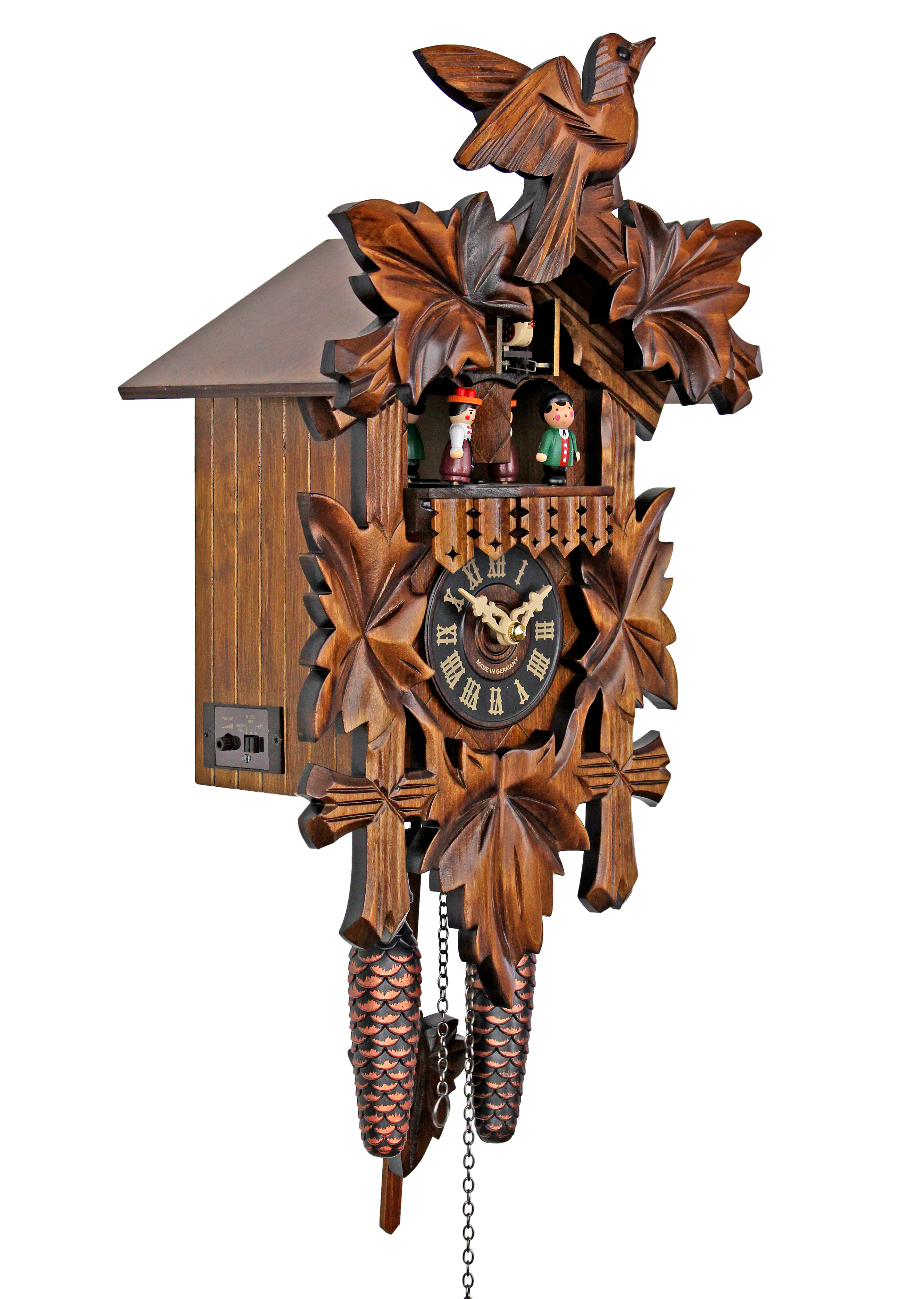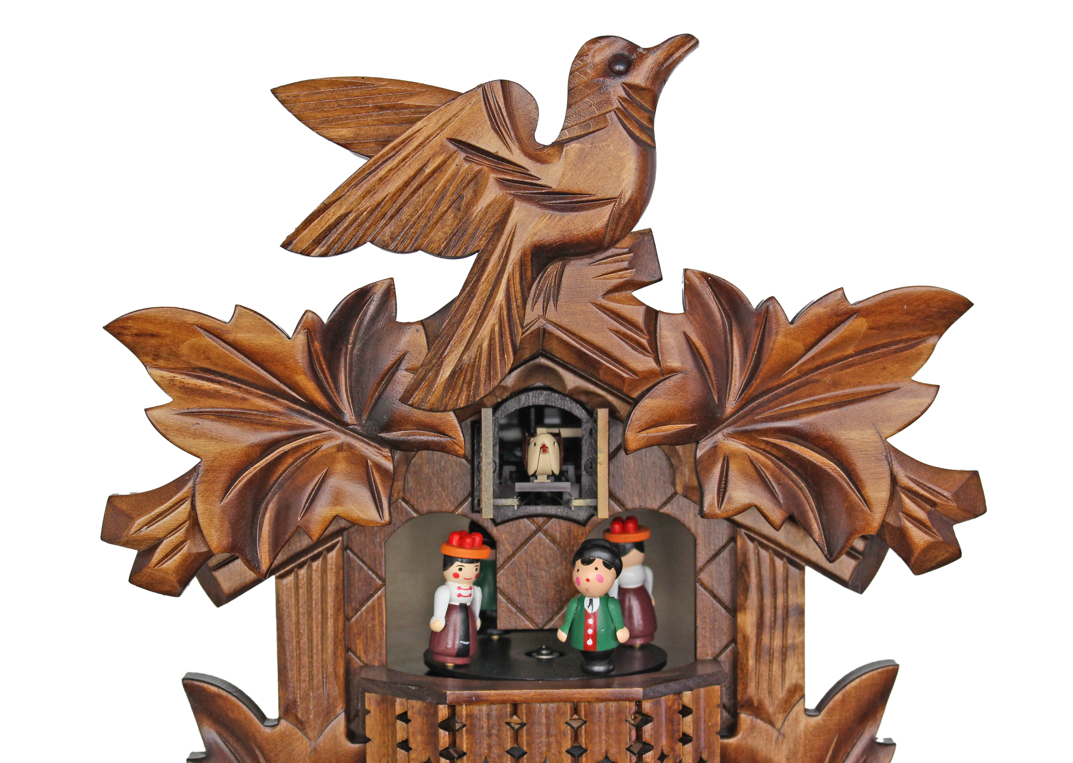 A traditional Black Forest cuckoo clock with a hand-carved cuckoo bird and vine leaves. The cuckoo calls on the hour according to the time and is followed by an echo and by one of 12 alternating melodies. Meanwhile the figurines on the balcony, wearing the Black Forest traditional costume, dance around to the music. A light sensor automatically turns off the cuckoo sound and the music at night, or they can be turned off anytime by means of a manual switch.